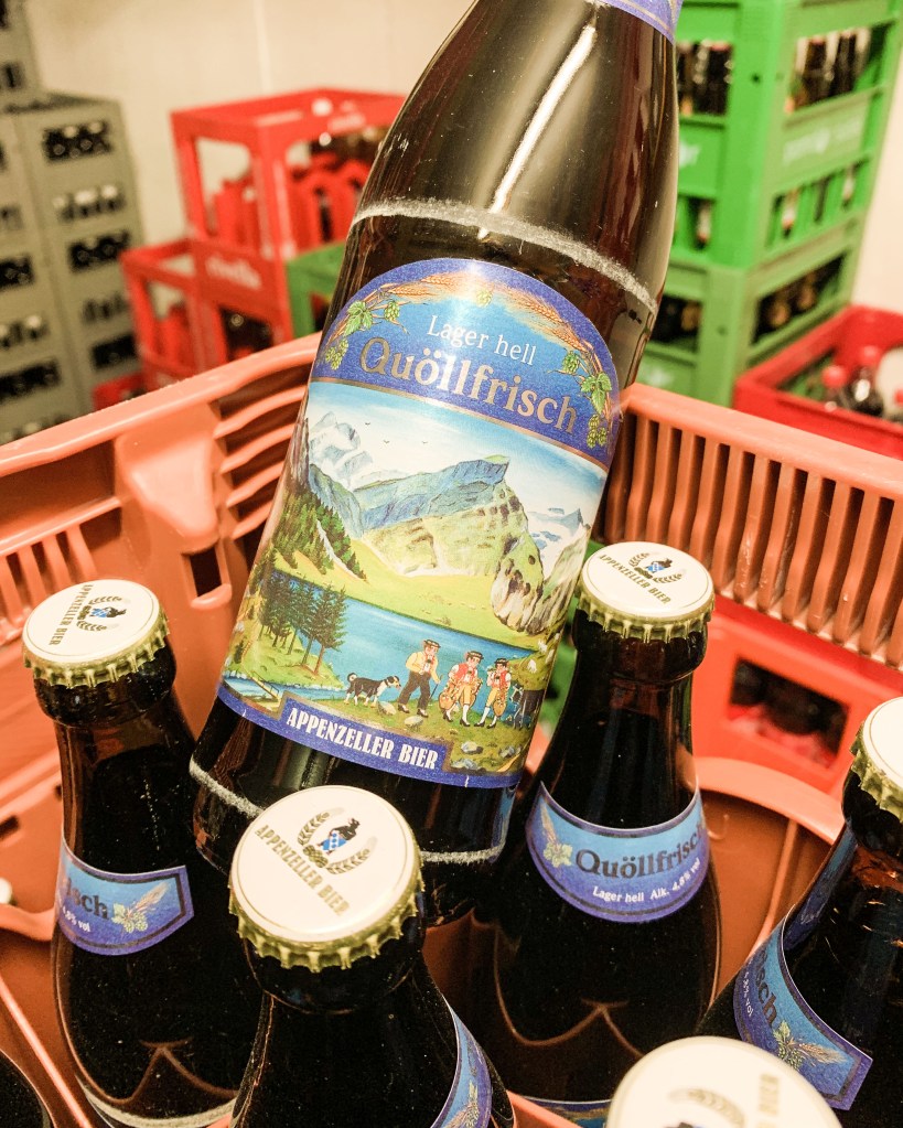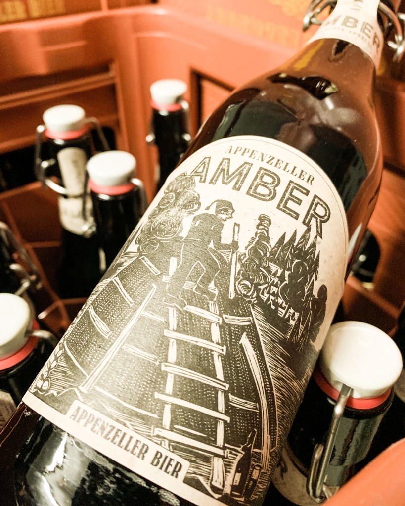 Das bernsteinfarbene Appenzeller Amber besticht mit seinem leicht nussigen, würzigen Geschmack. Erhältlich in 50cl-Bügelflaschen