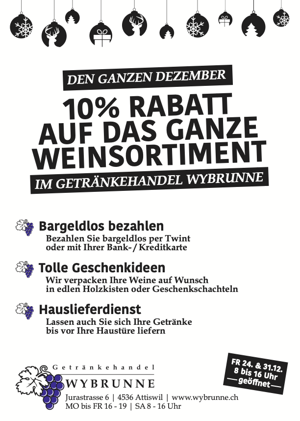Während dem ganzen Monat Dezember offerieren wir Ihnen 10 % Rabatt auf allen Weinen in unserem Sortiment. Wir freuen uns auf Ihren Besuch während den regulären Öffnungszeiten: montags bis freitags von 16 bis 19 Uhr und samstags von 8 bis 16 Uhr.